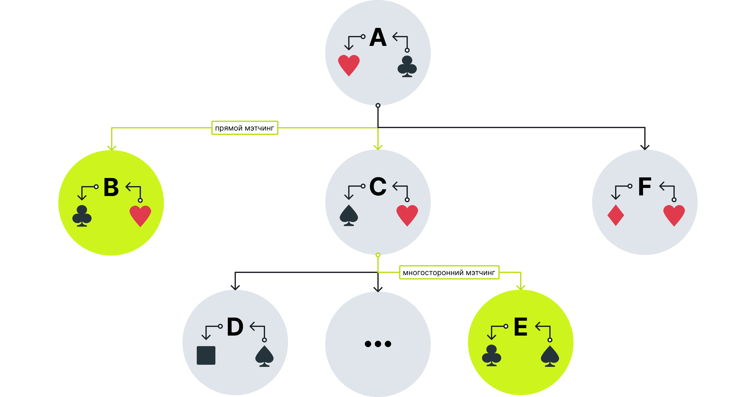 Многосторонний мэтчинг: алгоритм связывает участников в замкнутые циклы (например, А → В → С → А).