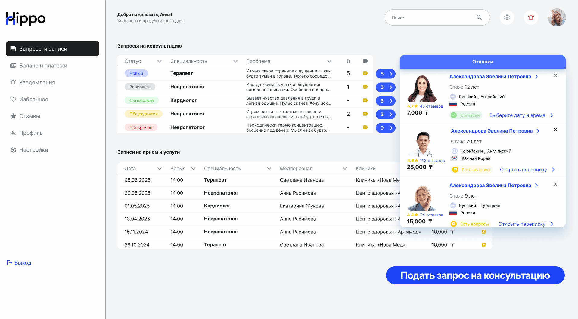 По бизнес логике фаундеров если врач сам выбирает, откликаться или нет — он более вовлечён, лучше удерживается, и может ощущать ценность платформы. Поэтому я спроектировала многоэтапный сценарий подачи запроса на консультацию, который: