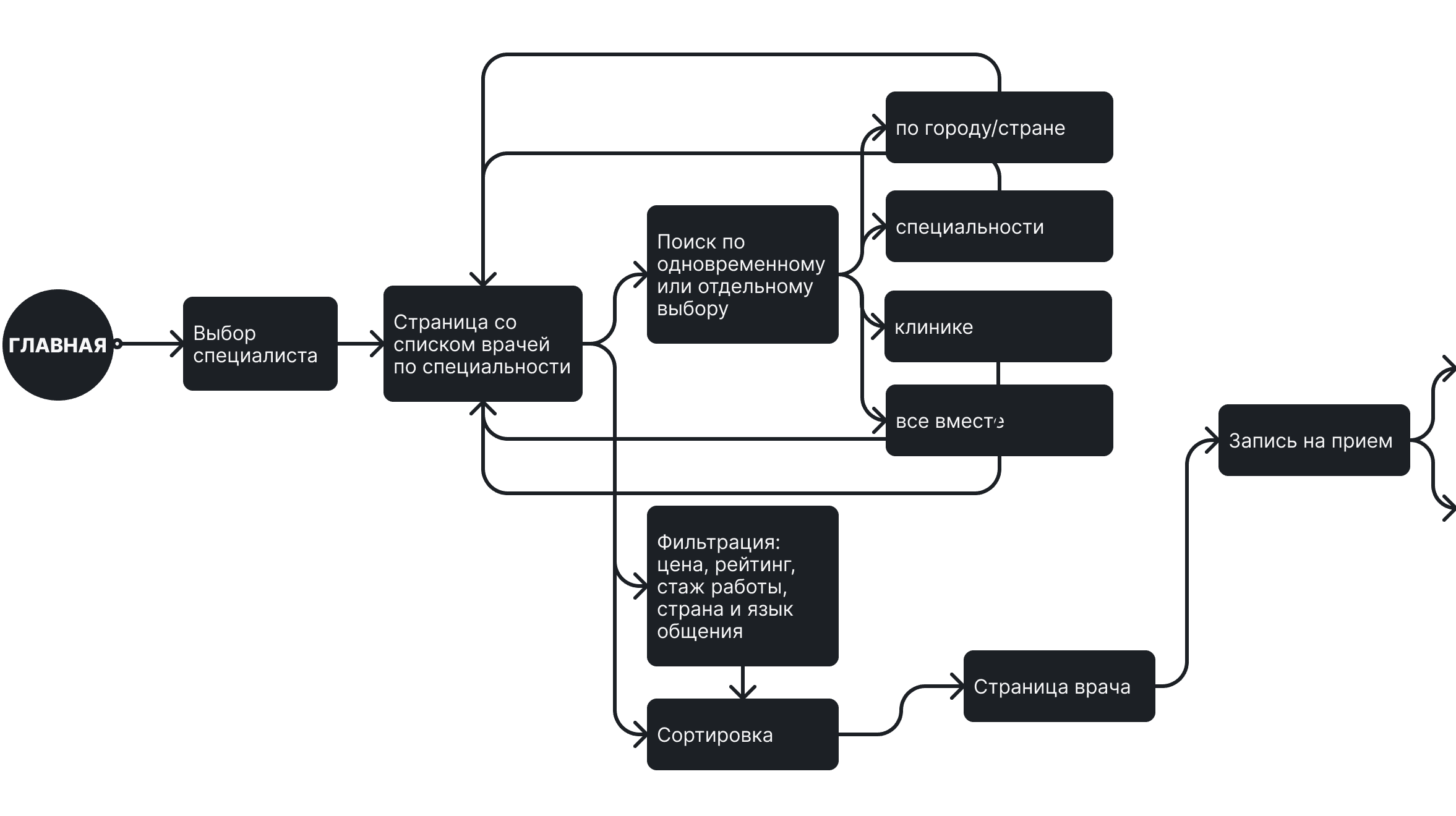 Дополнительно реализовала альтернативный сценарий с классическим поиском и фильтрацией и ручным выбором врача, как расширение для самостоятельных пользователей.
