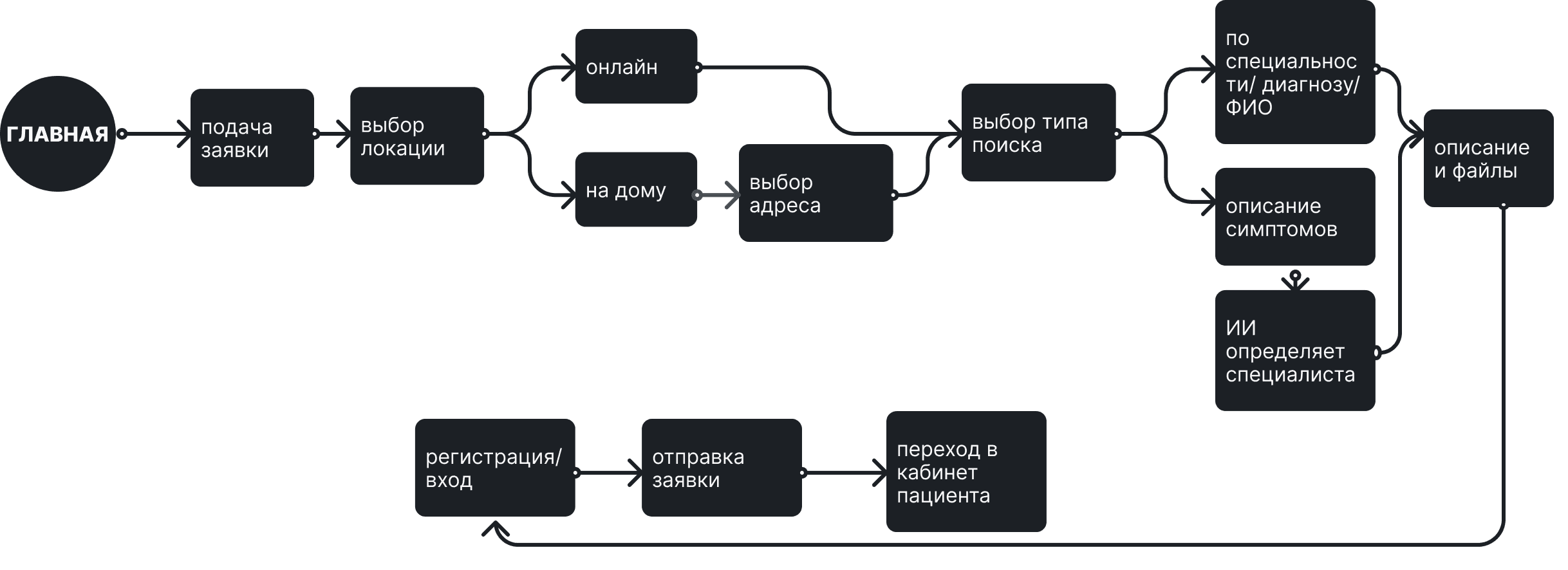 У фаундеров была идея основного сценария отправки пациентом заявки на консультацию врачам без четкой логики и базовые критерии кабинета врача и пациента.