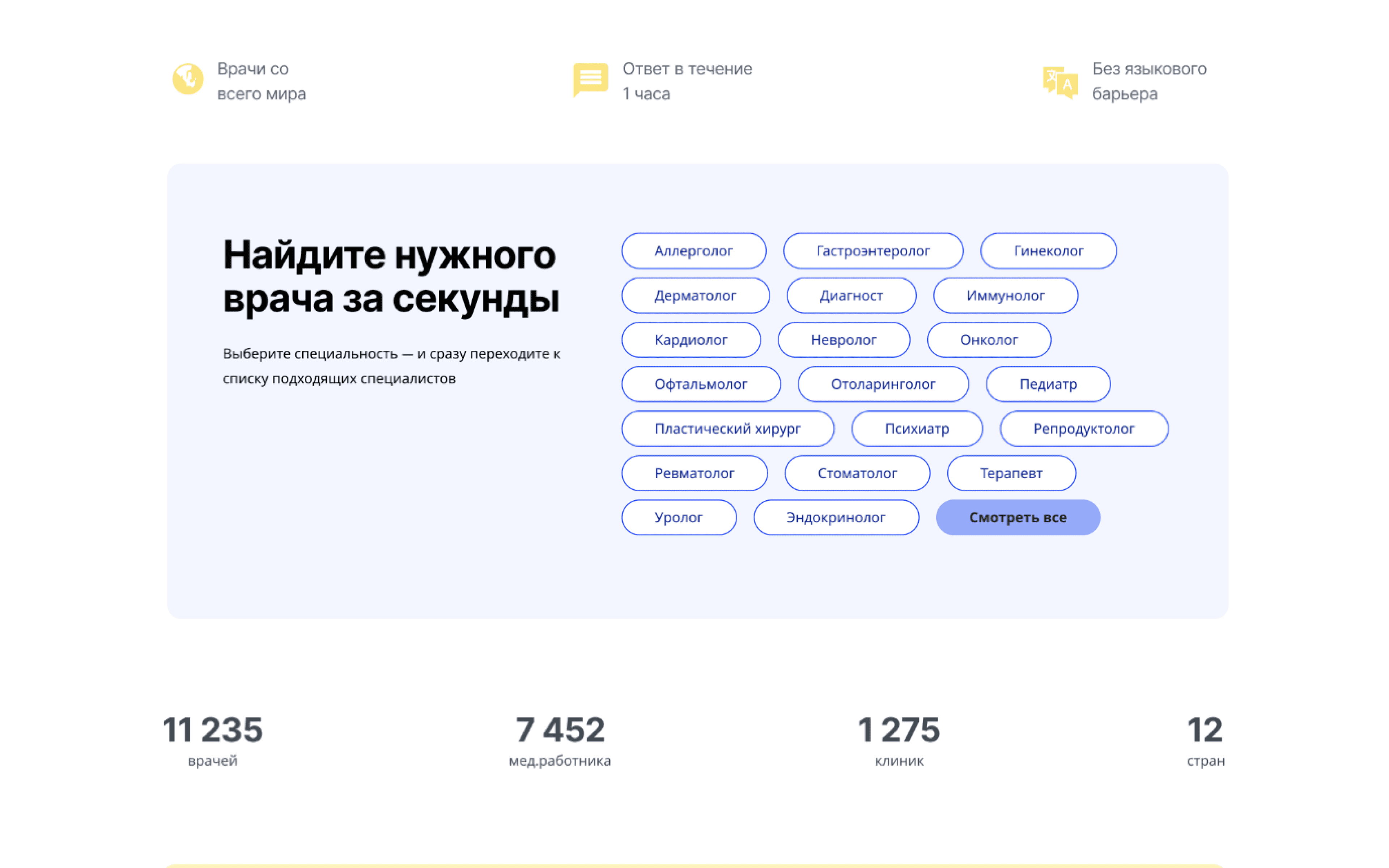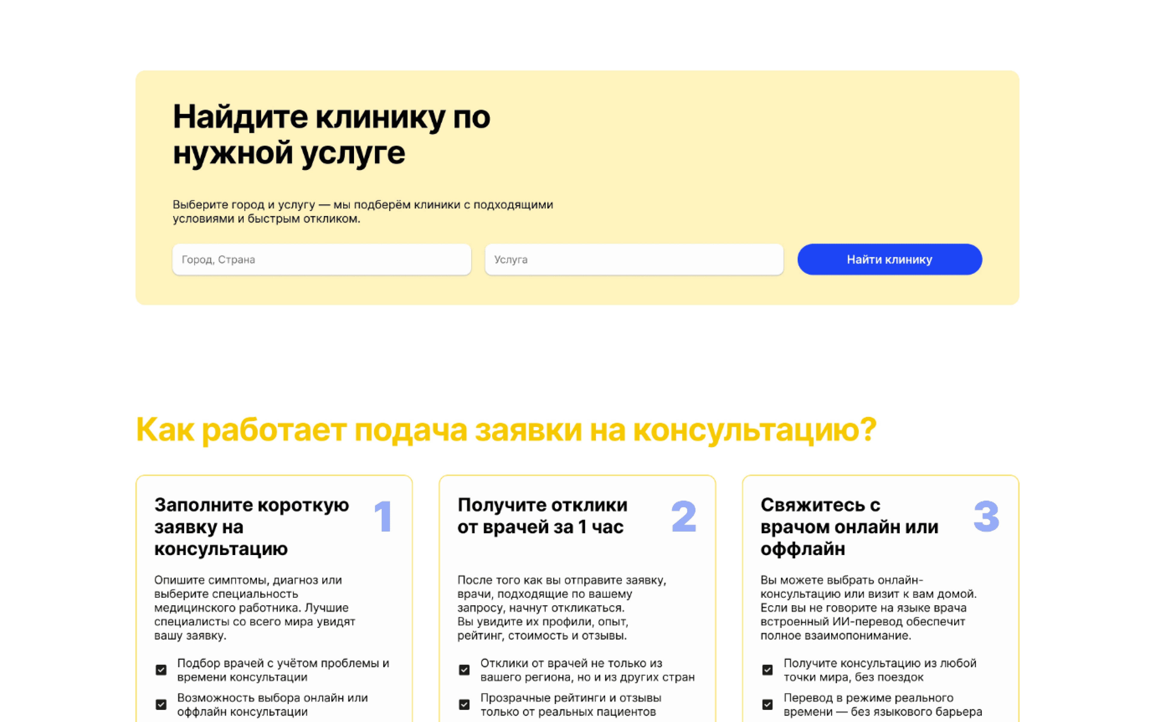 • На главной странице добавили блок поиска клиники и услугу и городу/стране.