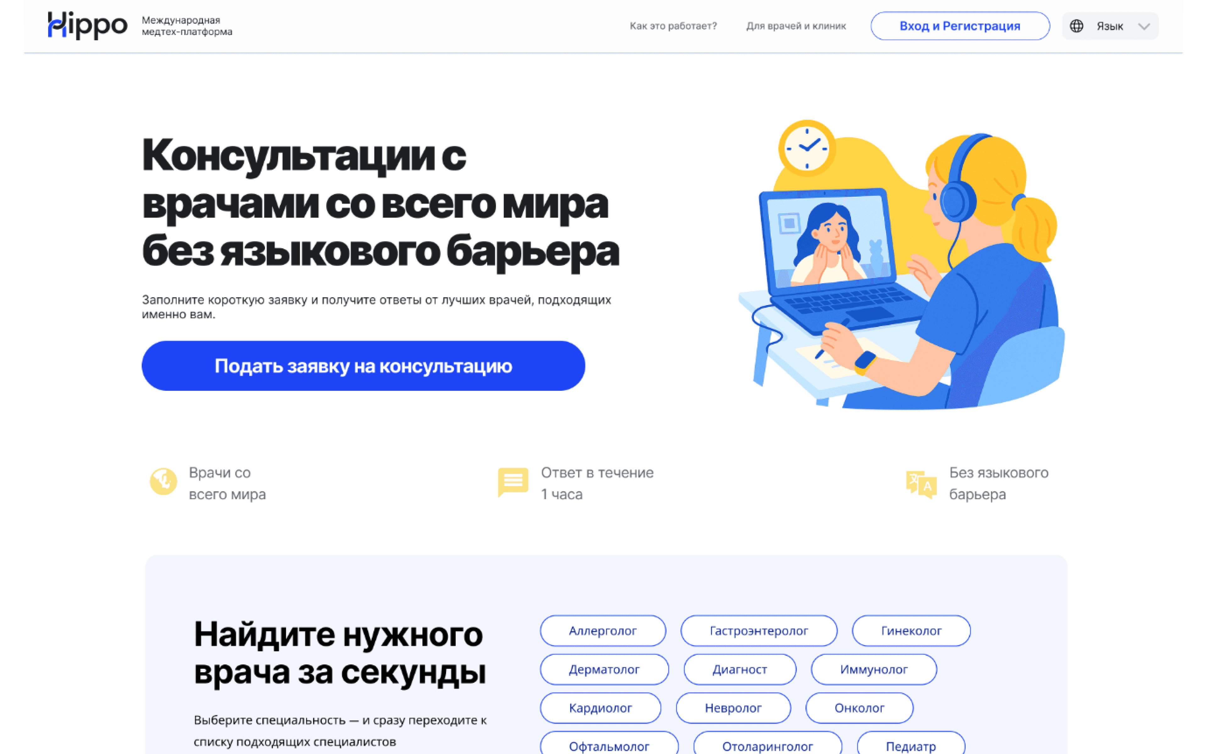 HIPPO — это международная медтех-платформа, позволяющая находить врачей и клиники по всему миру, соответствующих запросам пациентов, а также включающая автоматический перевод речи и документов во время консультации.